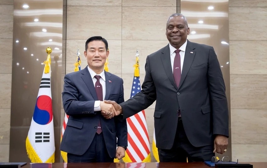 Bộ trưởng Quốc phòng Hàn Quốc Shin Won-sik (trái) bắt tay Bộ trưởng Quốc phòng Mỹ Lloyd Austin. Ảnh: BỘ QUỐC PHÒNG HÀN QUỐC