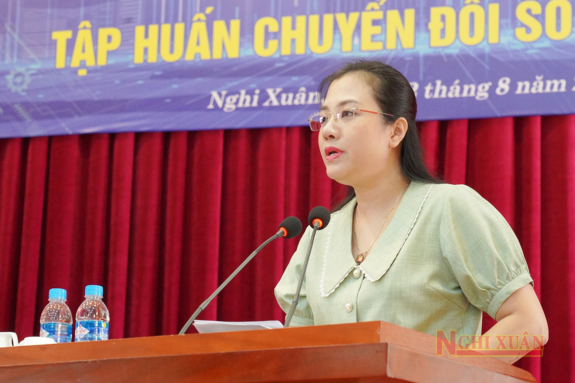 Phó Cục trưởng Cục chuyển đổi số quốc gia Trần Thị Quốc Hiền: "Nghi Xuân là huyện đầu tiên trong cả nước phối hợp Cục chuyển đổi số quốc gia tập huấn chuyển đổi số. Ngoài những nội dung kiến thức bài giảng, các giảng viên của Cục sẽ có dẫn chứng đưa ra những ví dụ, kinh nghiệm, bài học thực tiễn, thiết thực, gần gũi với địa phương để các cơ quan, đơn vị trên địa bàn huyện nghiên cứu, tham khảo, tổ chức thực hiện chuyển đổi số phù hợp với đặc thù và tình hình của huyện".