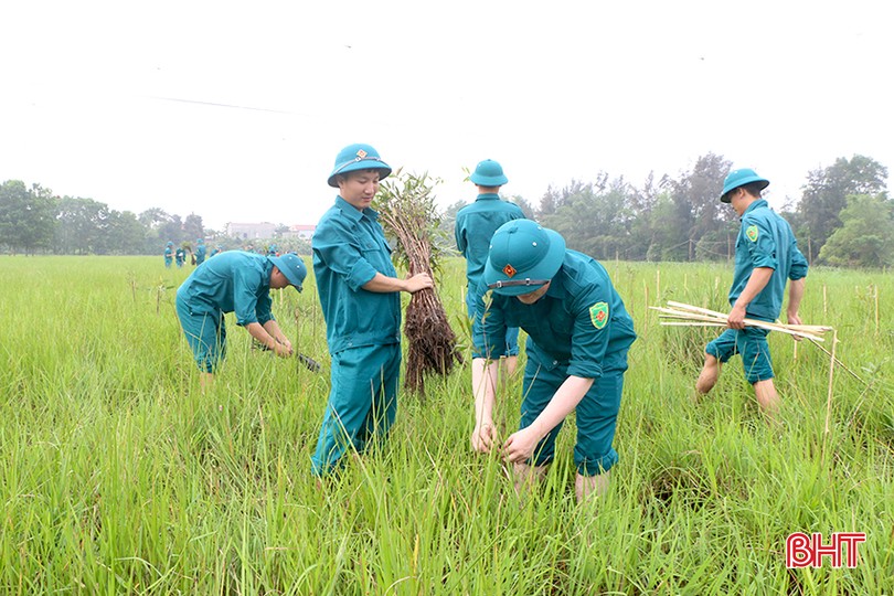 Lực lượng vũ trang TP Hà Tĩnh tham gia trồng cây tạo cảnh quan, môi trường sinh thái tại khu vực sông Đông (phường Thạch Linh).