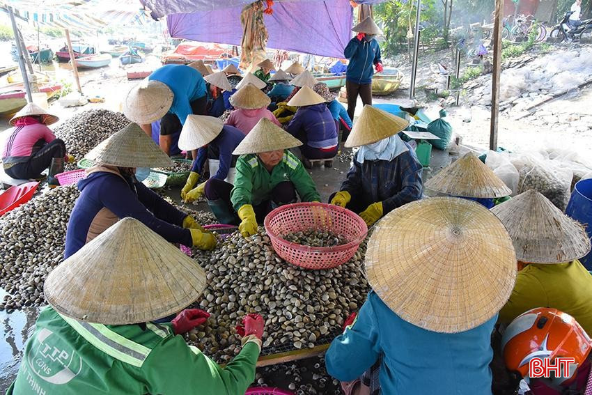 Hợp tác xã NTTS Việt Hồng (xã Mai Phụ, Thạch Hà) thu hoạch ngao.