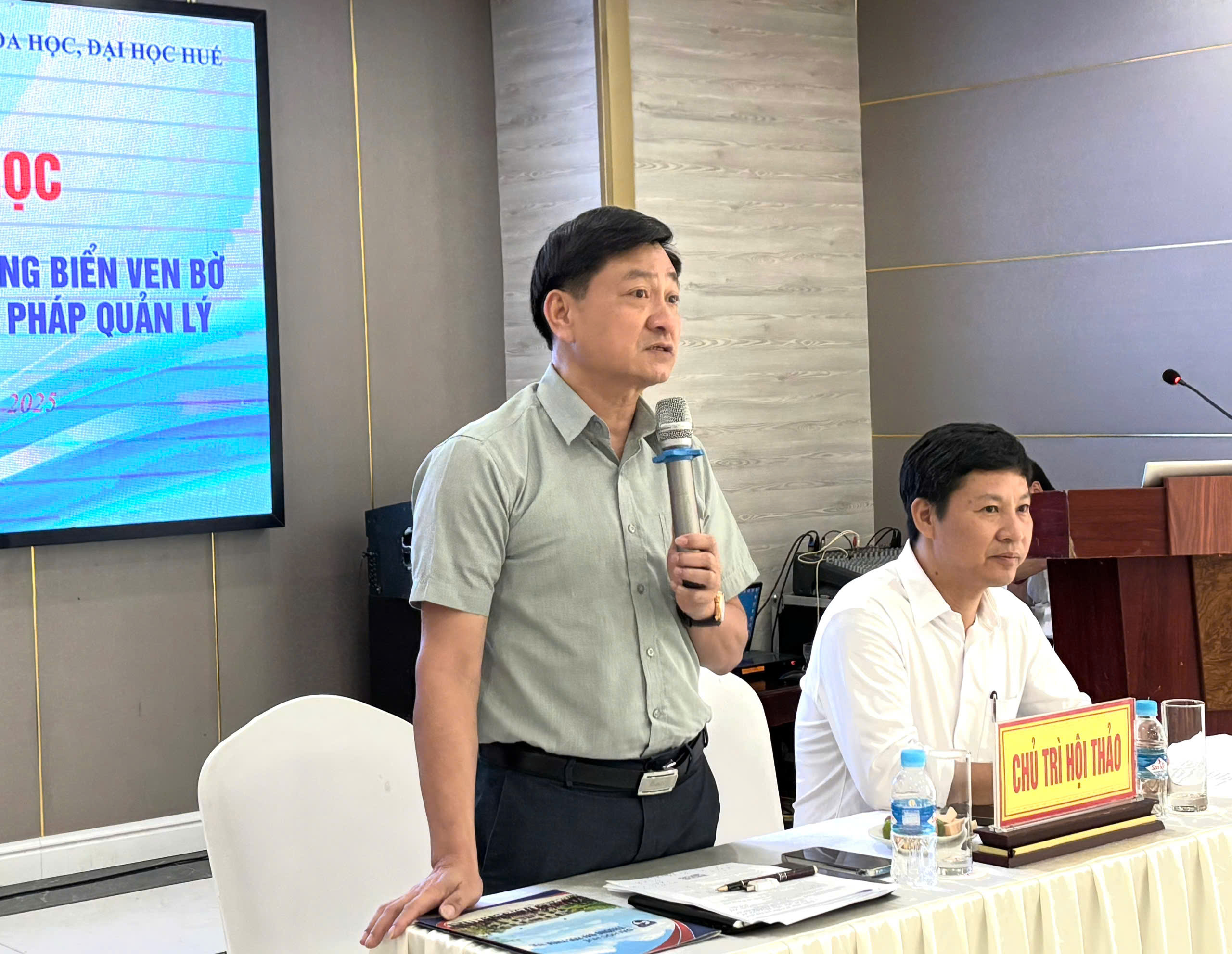 Chủ trì Hội thảo có ông Bùi Phong An, PGĐ Sở Khoa học & Công nghệ Hà Tĩnh và ông Nguyễn Văn Huy, PGS.TS Phó Trưởng khoa Thuỷ sản - Trường ĐH Khoa học, ĐH Huế
