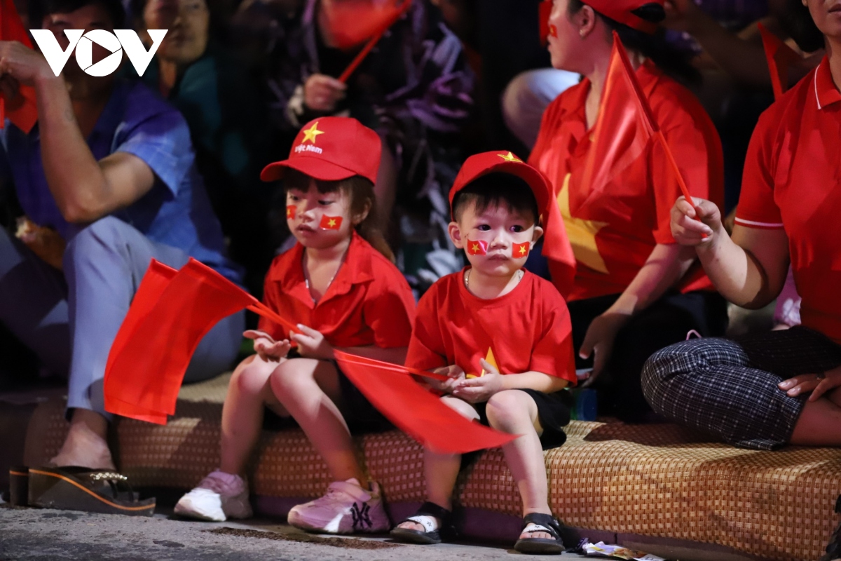 Các em nhỏ cũng háo hức mặc áo cờ đỏ sao vàng, dán stick cờ Tổ quốc, theo chân bố mẹ, ông bà dậy từ sớm để tìm chỗ ngồi chờ xem diễu binh, diễu hành.