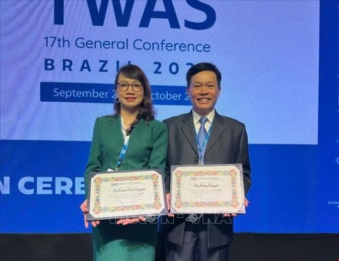 Giáo sư, Tiến sĩ Nguyễn Thế Hoàng và Giáo sư, Tiến sĩ Nguyễn Thị Thanh Mai được công nhận là Viện sĩ của Viện Hàn lâm Khoa học Thế giới. Ảnh: TTXVN
