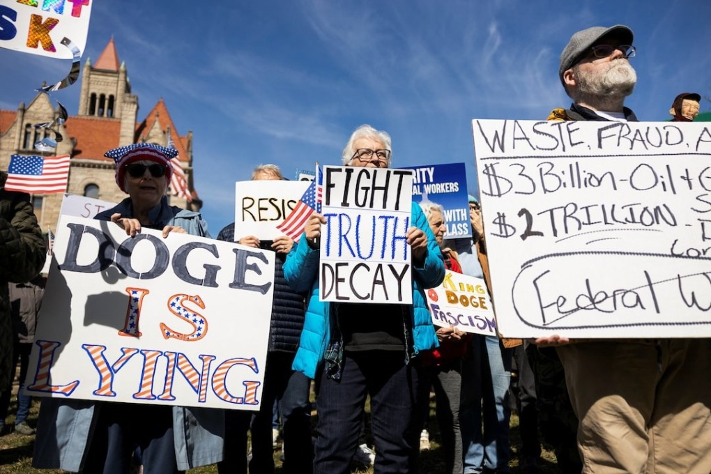 Người biểu tình phản đối kế hoạch cắt giảm nhân sự của DOGE ở Parkersburg, Tây Virginia, ngày 28/2. Ảnh: Reuters
