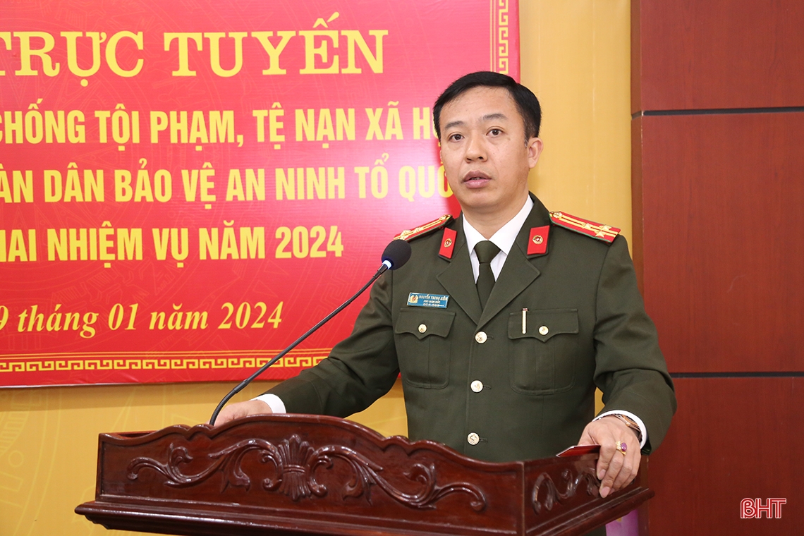 Thượng tá Nguyễn Trung Kiên - Phó Giám đốc Công an tỉnh báo cáo kết quả công tác phòng, chống tội phạm, tệ nạn xã hội và xây dựng phong trào toàn dân bảo vệ an ninh Tổ quốc năm 2023, nhiệm vụ trọng tâm năm 2024.
