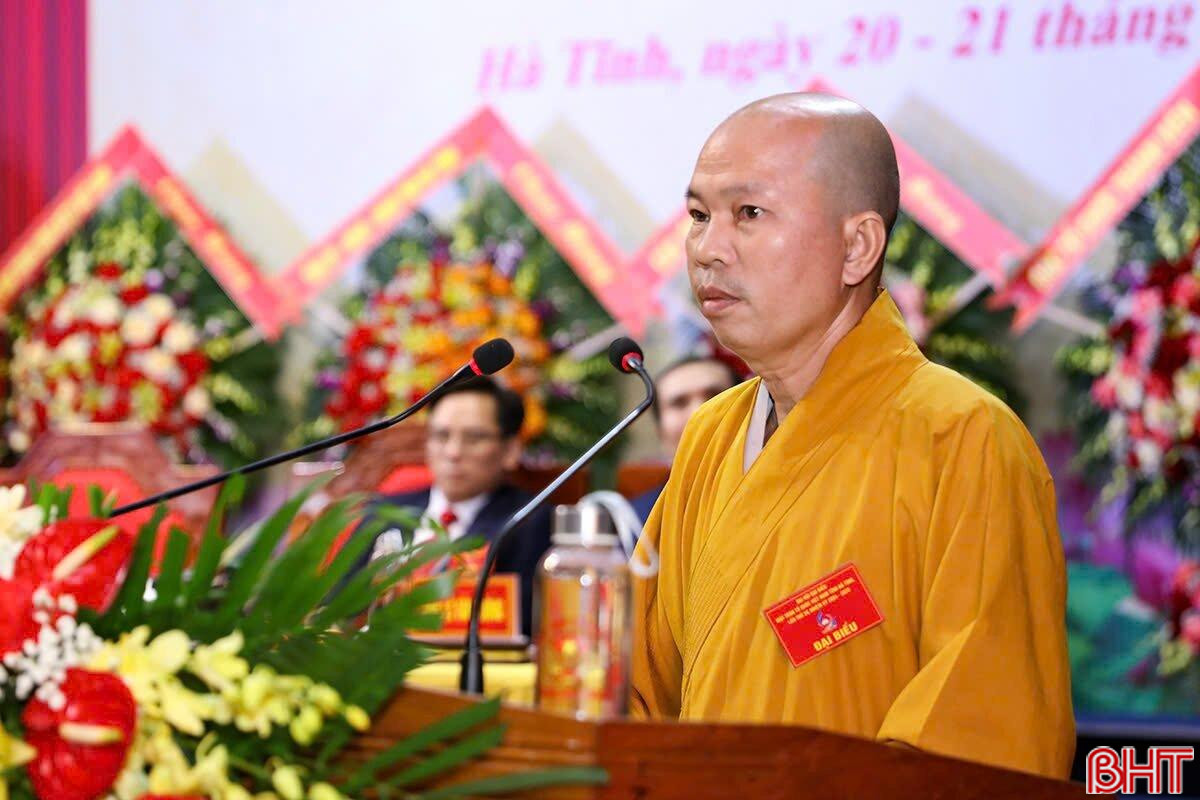 Đại đức Thích Chúc Giác - Phó ban Hoằng pháp Ban Trị sự Giáo hội Phật giáo tỉnh trình bày tham luận với nội dung "Ban Trị sự Phật giáo tỉnh với các phong trào thi đua yêu nước, các chương trình an sinh xã hội, góp phần xây dựng khối đại đoàn kết toàn dân tộc".