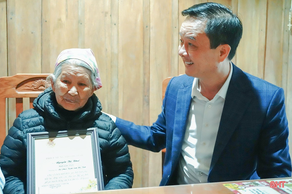Phó Chủ tịch Thường trực UBND tỉnh Trần Báu Hà và đoàn cũng đến thăm hỏi, chúc thọ cụ Nguyễn Thị Khai (SN 1926 thôn Kim Sơn, xã Phúc Trạch), năm nay tròn 100 tuổi.