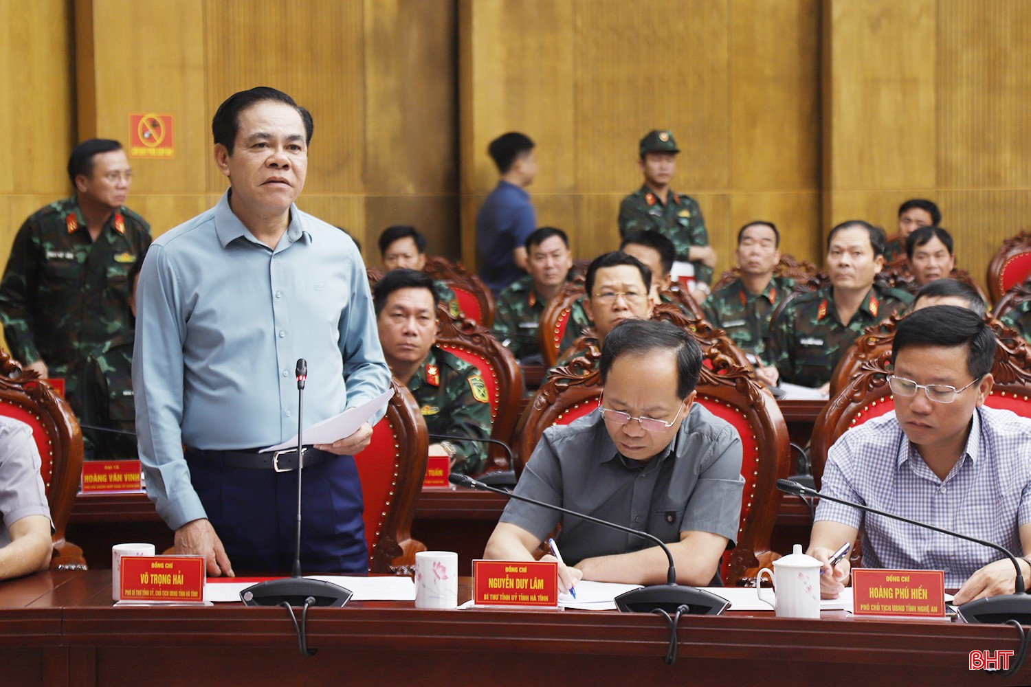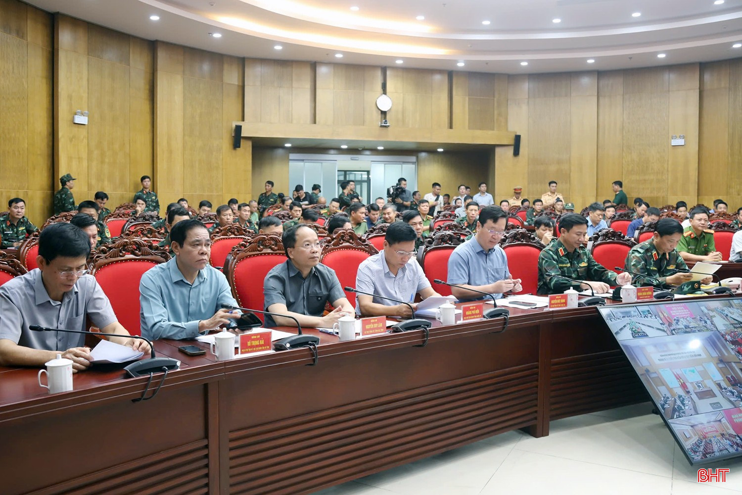 Bí thư Tỉnh uỷ Nguyễn Duy Lâm và Chủ tịch UBND tỉnh Võ Trọng Hải tham dự tại điểm cầu Quân khu 4. Ảnh: Thùy Dương