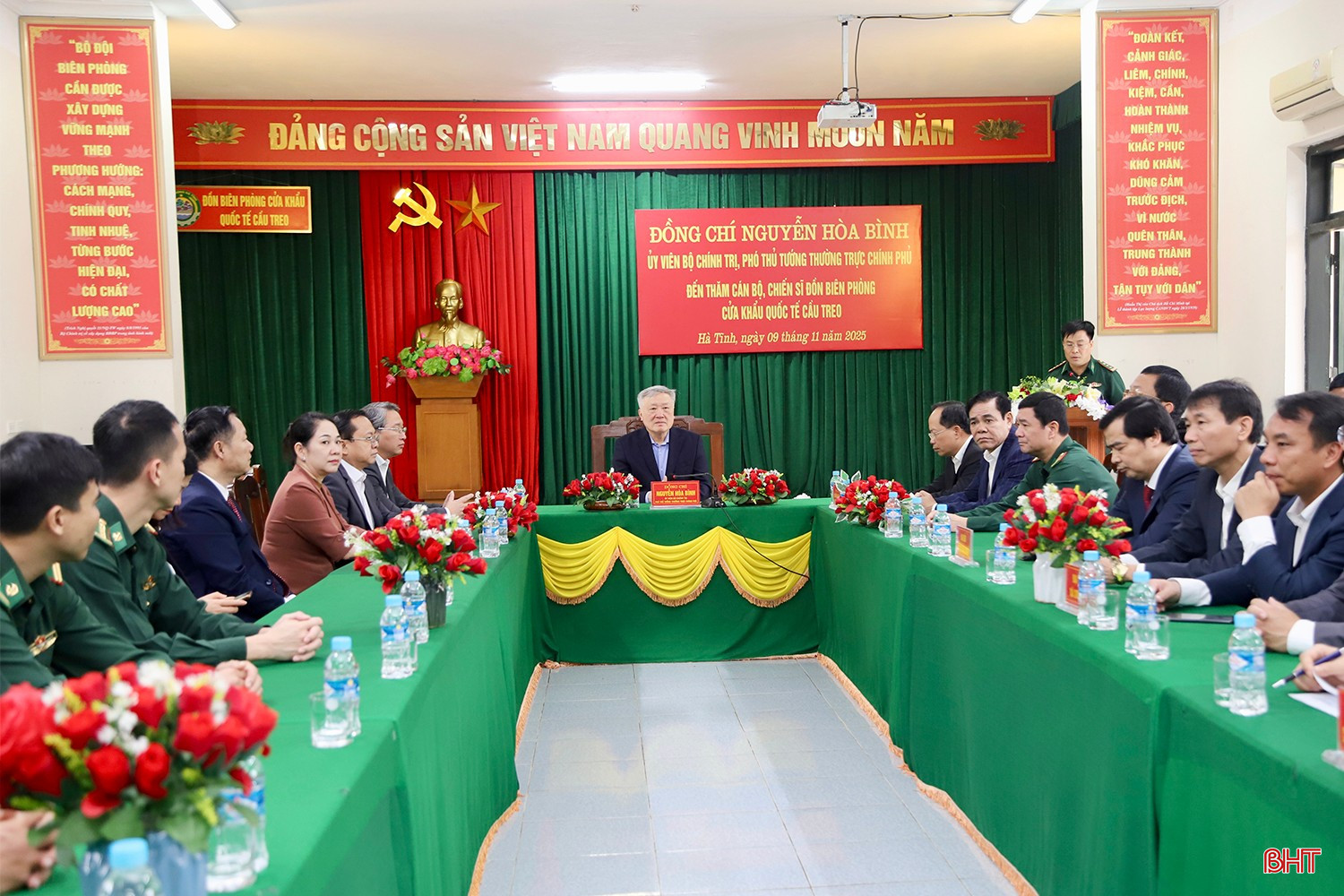 Trong khuôn khổ chuyến công tác tại Hà Tĩnh, sáng 9/11, đồng chí Nguyễn Hòa Bình - Ủy viên Bộ Chính trị, Phó Thủ tướng Thường trực Chính phủ và các đồng chí: Nguyễn Hải Ninh - Ủy viên BCH Trung ương Đảng, Bộ trưởng Bộ Tư pháp; Lê Tấn Cận - Thứ trưởng Bộ Tài chính; Nông Thị Hà - Thứ trưởng Bộ Dân tộc và Tôn giáo đến thăm, tặng quà cán bộ, chiến sĩ Đồn Biên phòng Cửa khẩu Quốc tế Cầu Treo và cán bộ, Nhân dân xã Sơn Kim 1.