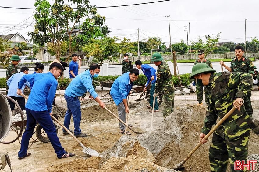Cán bộ, nhân viên Ban CHQS huyện Kỳ Anh giúp bà con giáo dân xã Kỳ Khang (huyện Kỳ Anh) xây dựng mô hình “Khu sinh hoạt văn hóa cộng đồng thôn”.