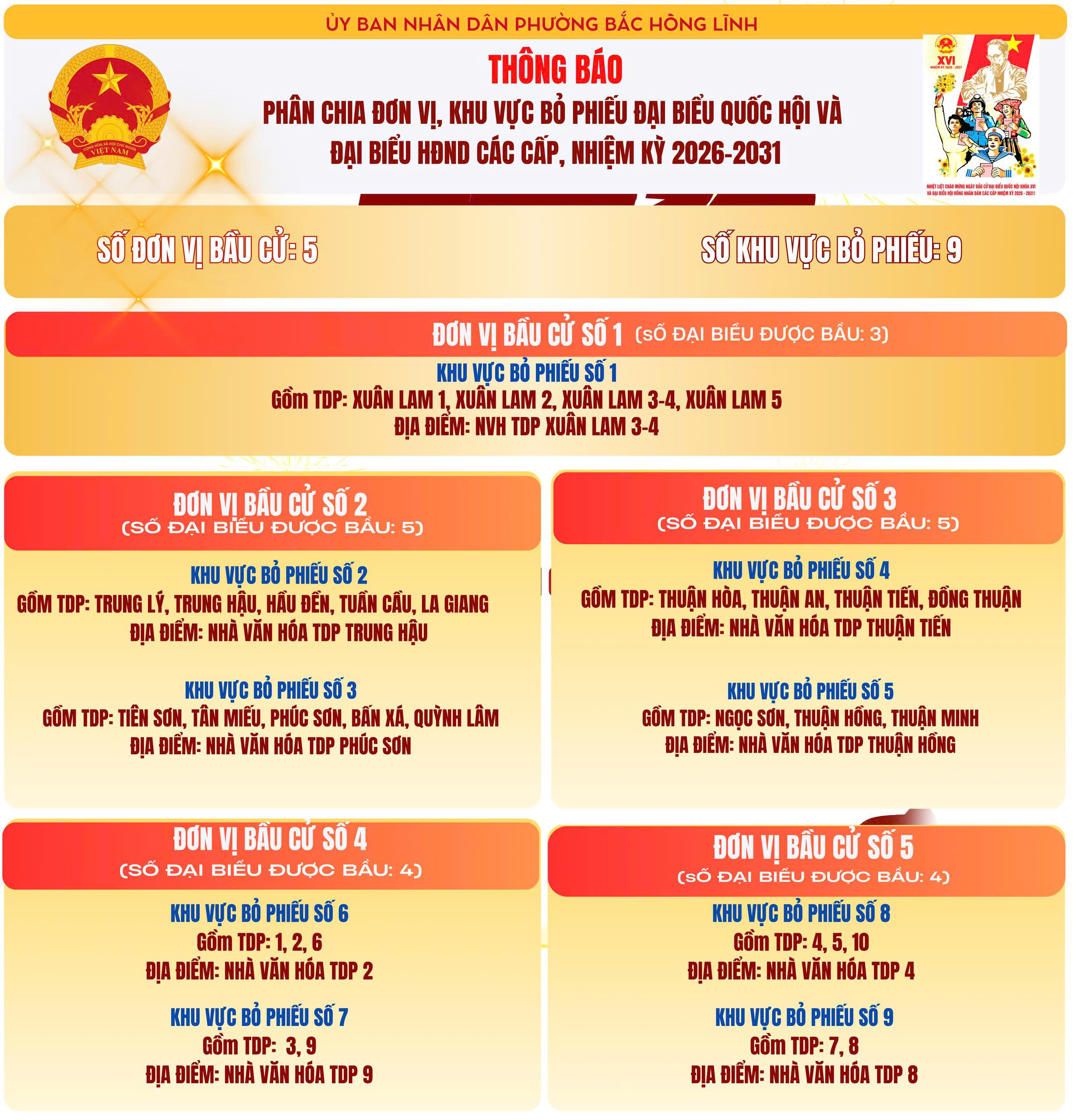 Phường Bắc Hồng Lĩnh phân chia khu vực bỏ phiếu bầu cử đại biểu Quốc hội khóa XVI và bầu cử đại biểu HĐND các cấp, nhiệm kỳ 2026-2031