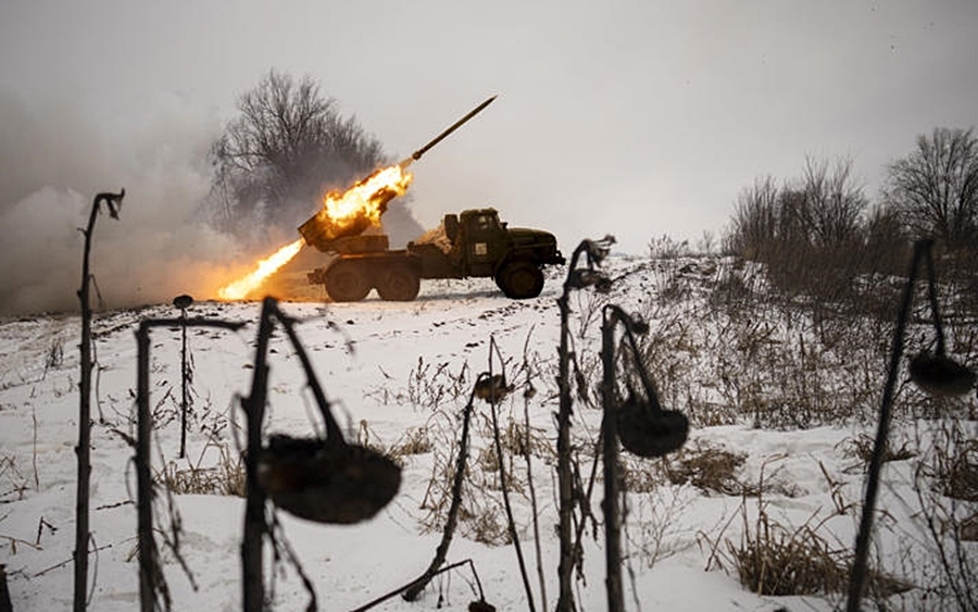 Pháo phản lực Ukraine nhả đạn trong cuộc đụng độ với Nga ở Kharkov hồi năm 2023. Cuộc xung đột này cho tới nay đã khiến nhiều người dân Ukraine mệt mỏi, thậm chí kiệt sức. Ảnh: AP.