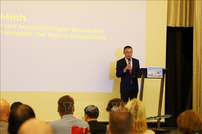 Đại sứ Vũ Quang Minh phát biểu tại Hội thảo xúc tiến du lịch và phát động bán sản phẩm tại thị trường Đức. Ảnh: Mạnh Hùng - PV TTXVN tại CHLB Đức.