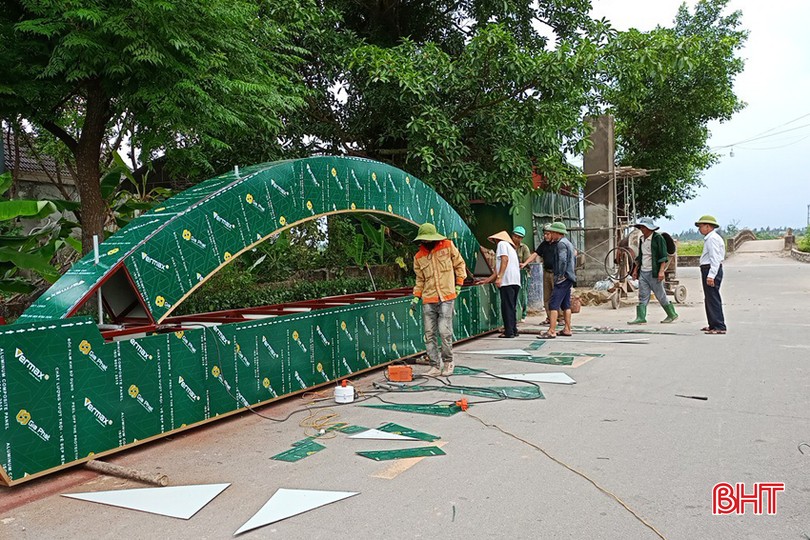 Tổ liên gia sinh thái Cựa Đình (thôn Liên Tiến, xã Mai Phụ) gấp rút hoàn thành cổng chào có gắn hệ thống đèn trang trí.