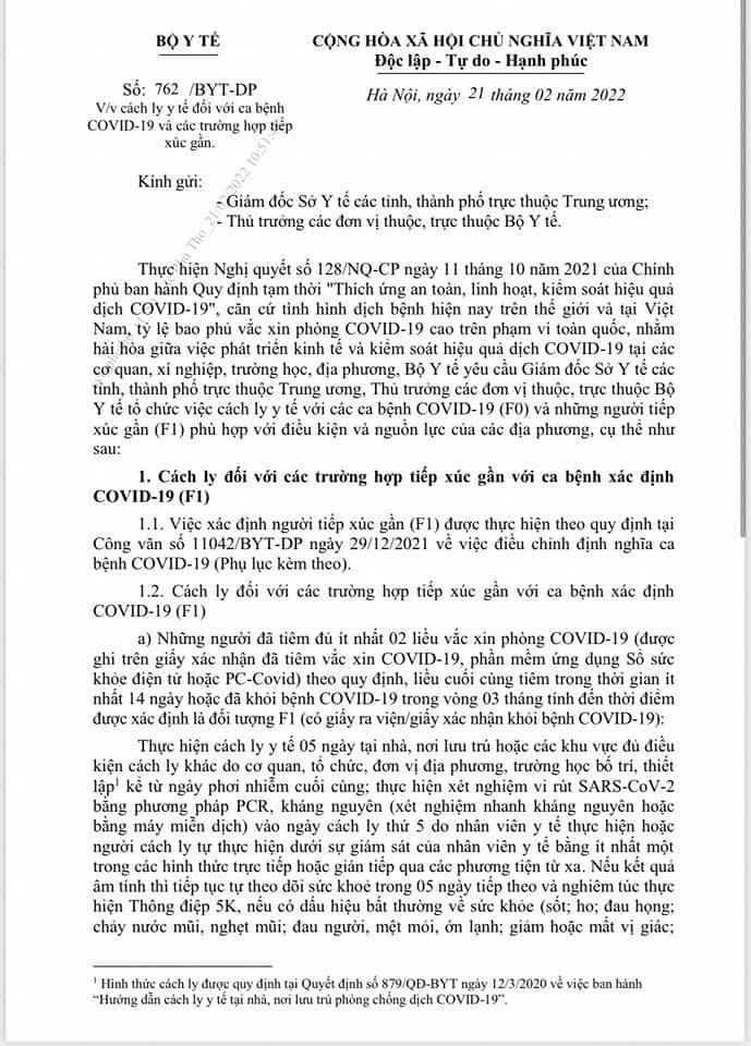 Ngày 21/1, Bộ Y tế ban hành hướng dẫn mới về cách ly y tế đối với F0 và F1. Theo hướng dẫn này, F1 tiêm đủ ít nhất 2 liều vắc-xin phòng COVID-19, liều cuối cùng tiêm trong thời gian ít nhất 14 ngày hoặc đã khỏi bệnh trong vòng 3 tháng tính đến thời điểm được xác định là F1 (có giấy ra viện/giấy xác nhận khỏi bệnh COVID-19) sẽ cách ly 5 ngày tại nhà, nơi lưu trú hoặc các khu vực đủ điều kiện cách ly khác do cơ quan, tổ chức, đơn vị địa phương, trường học bố trí, thiết lập kể từ ngày phơi nhiễm cuối cùng.