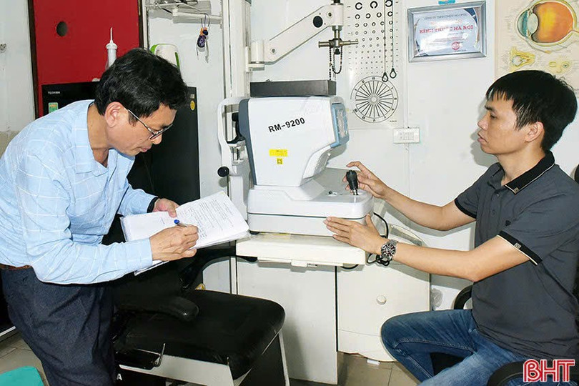 Ông Trần Hải Bình - Phó Trưởng phòng Đo lường tổng hợp (Chi cục Tiêu chuẩn Đo lường chất lượng - người bên trái) trong chuyến kiểm tra việc chấp hành các quy định về đo lường trong quản lý, sử dụng phương tiện đo để kinh doanh dịch vụ kính thuốc.