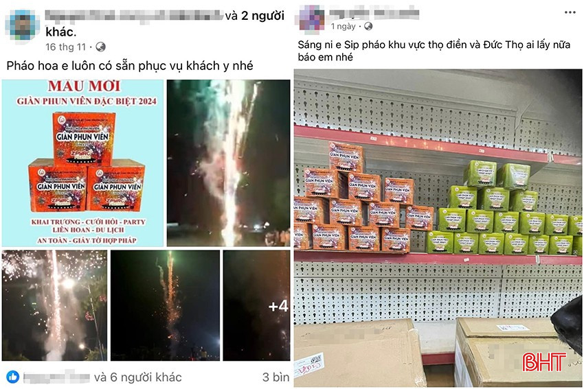 Trên Facebook cá nhân, tài khoản N.T (Cẩm Xuyên) quảng cáo: “Pháo hoa e luôn có sẵn phục vụ khách y nhé”. Còn tài khoản N.T.L (Vũ Quang) vô tư thông tin trên Facebook: “Sáng ni, em Sip pháo khu vực thọ điền và Đức Thọ ai lấy nữa báo em nhé”.