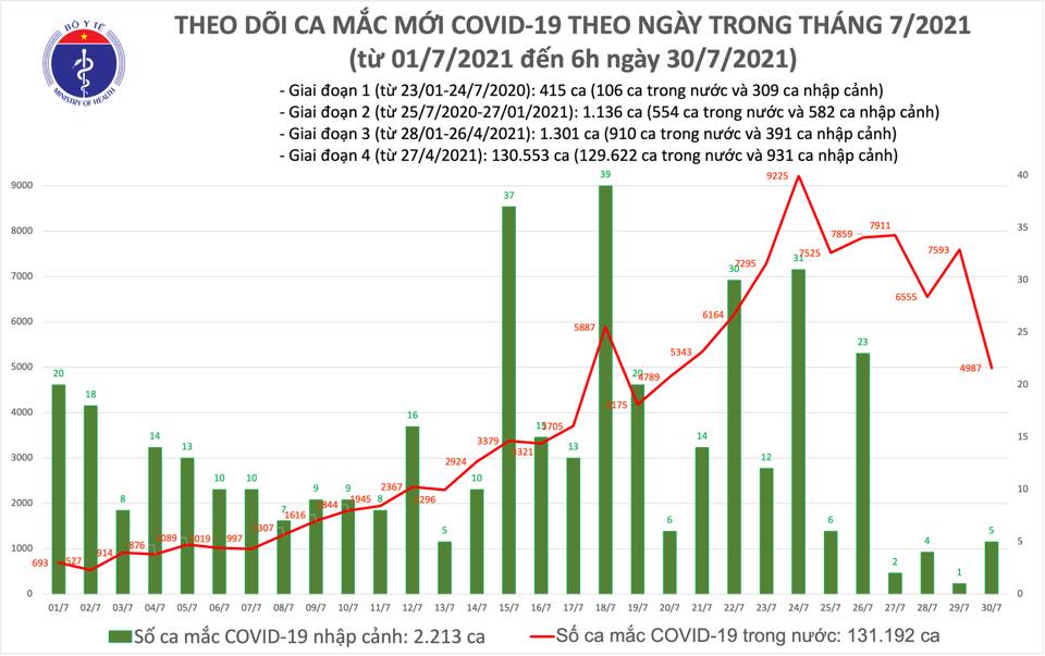 Tính từ 18h30 ngày 29/7 đến 6h ngày 30/7 trên Hệ thống Quốc gia quản lý ca bệnh COVID-19 ghi nhận 4.992 ca mắc mới, trong đó 05 ca nhập cảnh và 4.987 ca ghi nhận trong nước tại TP. Hồ Chí Minh (2.740), Bình Dương (1.284), Tiền Giang (242), Đồng Nai (203), Đồng Tháp (90), Tây Ninh (88), Bến Tre (79), Khánh Hòa (78), Hà Nội (63), Cần Thơ (23), Long An (21), Phú Yên (17), Bình Định (17), Kiên Giang (17), Vĩnh Long (15), Thái Nguyên (3), Đắk Nông (2), Hà Tĩnh (2), Lạng Sơn (2), Nam Định (1) trong đó có 987 ca trong cộng đồng.