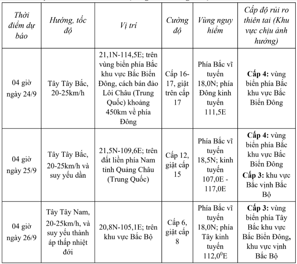 Từ ngày 24/9, vùng biển phía Đông của vịnh Bắc Bộ (bao gồm huyện đảo Bạch Long Vỹ) có gió mạnh dần lên cấp 6-7, giật cấp 9. Từ tối và đêm 24/9, khu vực vịnh Bắc Bộ (bao gồm đặc khu Bạch Long Vỹ, Vân Đồn, Cô Tô, Cát Hải và đảo Hòn Dấu) gió mạnh dần lên cấp 8-9, sóng biển cao 2,0-4,0m, vùng gần tâm bão đi qua cấp 10-12, giật cấp 14, sóng biển cao 4,0-6,0m; biển động dữ dội.
