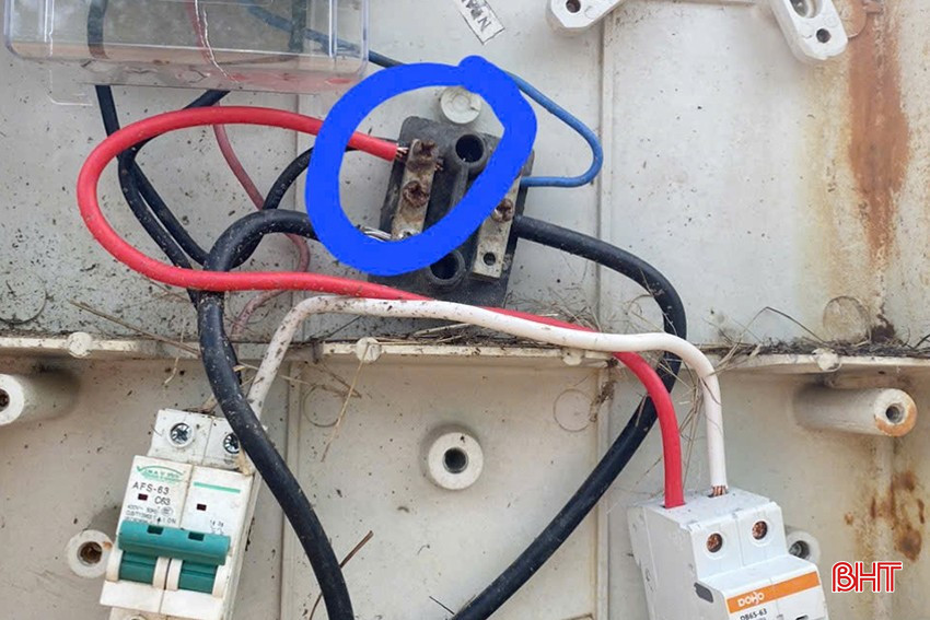 Một trường hợp ở Cẩm Xuyên "ăn cắp điện" bằng cách câu móc trực tiếp vào cầu chia điện áp hộp công tơ, không qua hệ thống đo đếm.