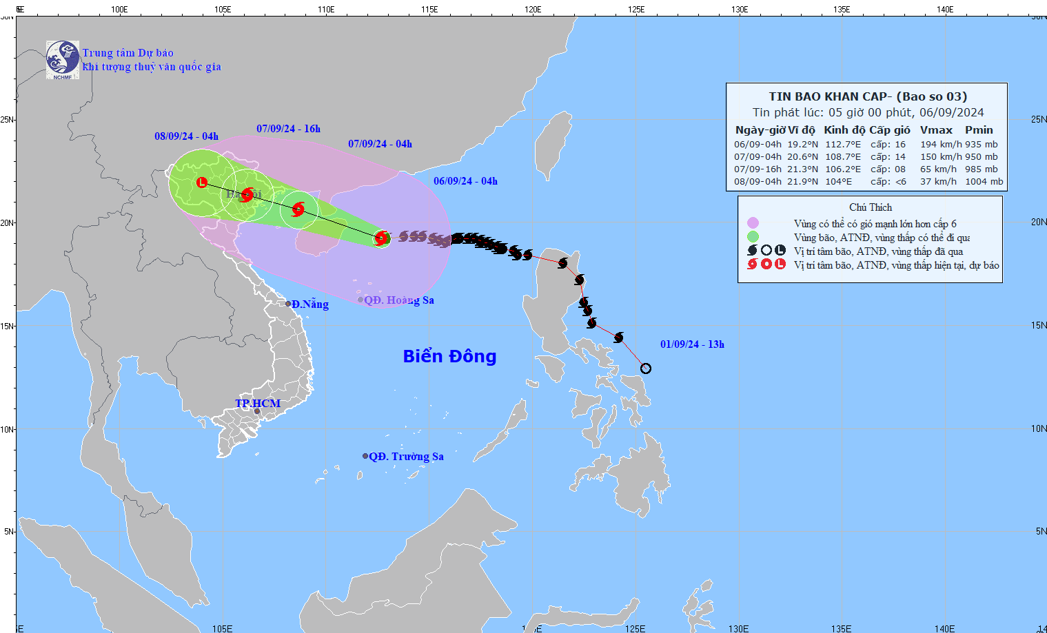 Hồi 4 giờ ngày 6/9, vị trí tâm siêu bão ở vào khoảng 19,2 độ Vĩ Bắc; 112,7 độ Kinh Đông, trên vùng biển phía Bắc khu vực Bắc Biển Đông, cách đảo Hải Nam (Trung Quốc) khoảng 200km về phía Đông Đông Nam; cách Quảng Ninh khoảng 620km về phía Đông Nam. Sức gió mạnh nhất vùng gần tâm siêu bão mạnh cấp 16 (184-201km/h), giật trên cấp 17, di chuyển theo hướng Tây, tốc độ khoảng 20km/h.