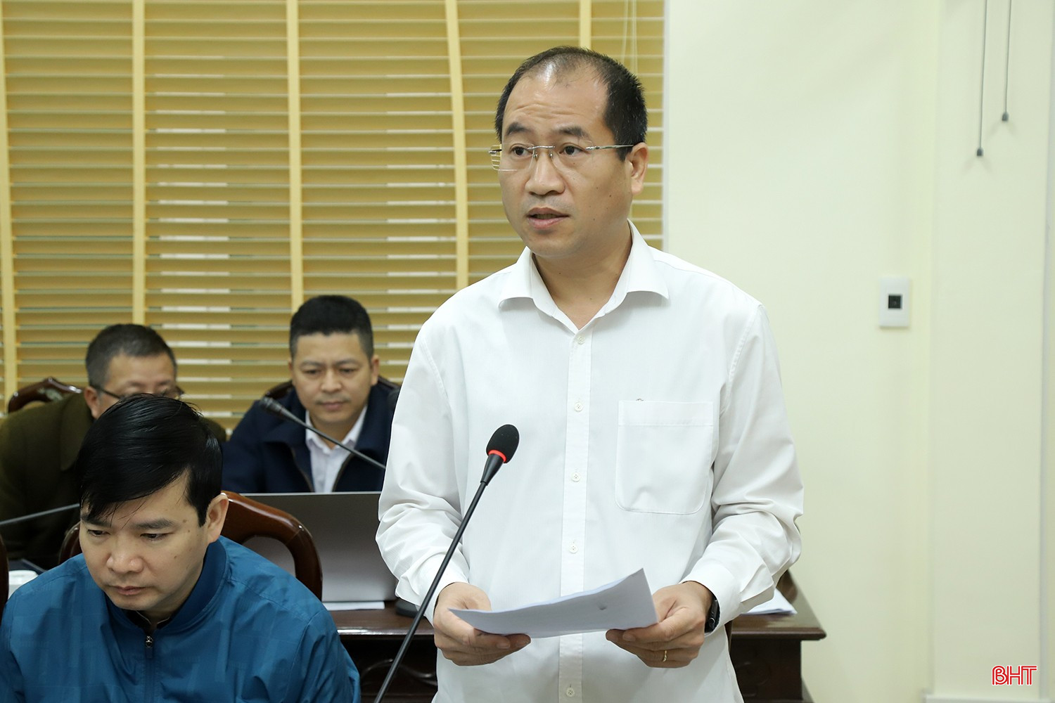 Giám đốc Sở NN&MT Lê Ngọc Huấn báo cáo về quá trình giải quyết một số nội dung liên quan tới lĩnh vực phụ trách được lãnh đạo tỉnh giao xử lý.