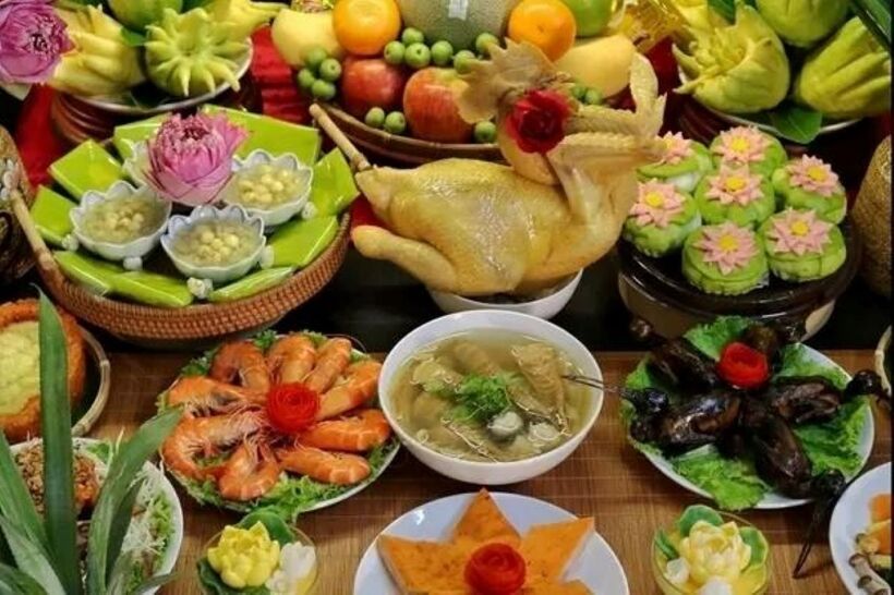 Mâm cơm chay hoặc một mâm ngũ quả được chuẩn bị đơn giản để cúng Phật, nên cúng vào ban ngày. Các món ăn chay trong mâm lễ cúng Phật thường có: giò, chả chay, nem chay hoặc nem nấm, canh nấm hoặc rau củ quả, đậu hũ...