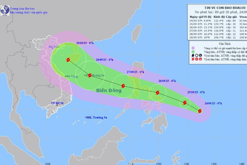 Dự báo khoảng đêm 26/9, bão Bualoi sẽ đi vào vùng biển phía đông khu vực giữa Biển Đông, trở thành cơn bão số 10 trong năm nay.