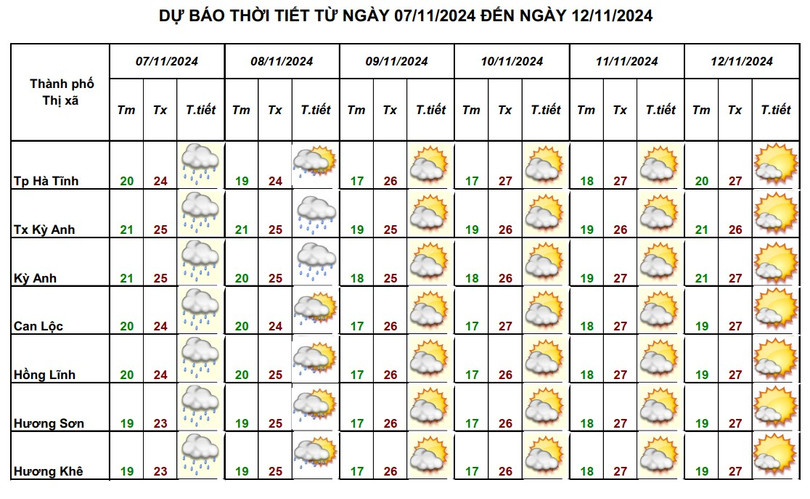 Ngày 7 và 8/11, khu vực Hà Tĩnh chủ yếu ảnh hưởng bởi khối không khí lạnh có cường độ suy yếu chậm nên mưa còn xảy ra diện mưa rải rác, có nơi mưa vừa. Đến sáng ngày 8, trưa chiều ngày 8/11 có nơi nắng nhẹ. Gió bắc đến tây bắc cấp 2, cấp 3; ven biển cấp 4, có lúc cấp 5. Nhiệt độ ngày đêm dao động 20 - 25°C và độ ẩm trung bình 85 - 90%. Đêm trời lạnh