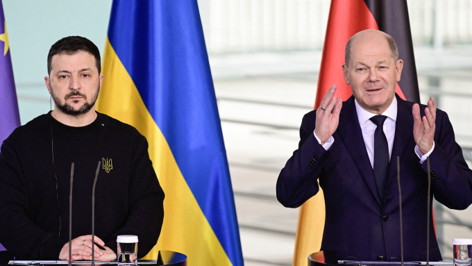 Tổng thống Zelensky (trái) và Thủ tướng Scholz họp báo chung tại Berlin ngày 16/2. Ảnh: AFP