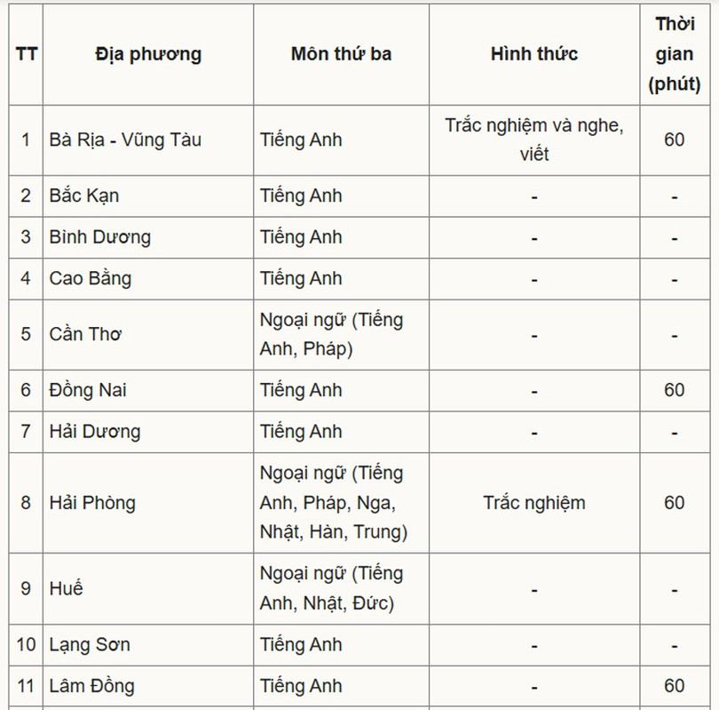 Đến 7/2, khoảng 20 địa phương đã công bố môn thứ ba thi lớp 10, tất cả đều chọn Tiếng Anh hoặc Ngoại ngữ (gồm Tiếng Anh và một số ngoại ngữ khác). Riêng Hà Nội hôm qua cho biết sẽ công bố môn thi thứ ba vào cuối tháng 3 như mọi năm.