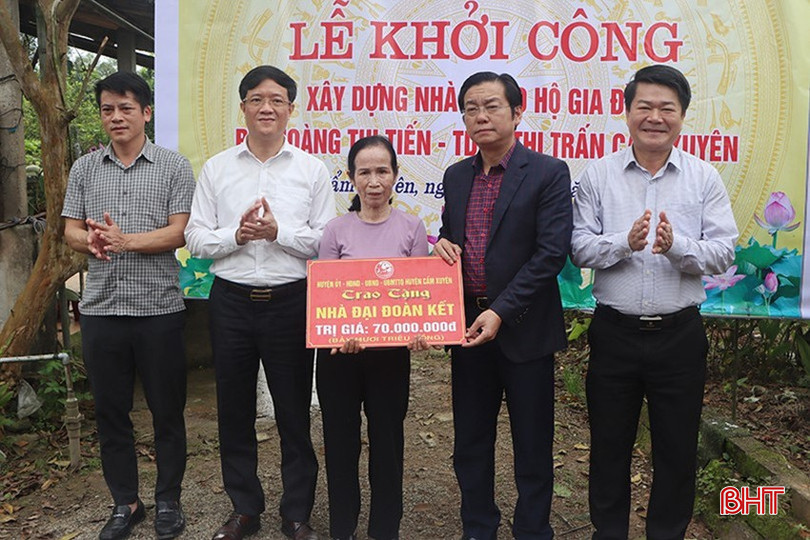Lãnh đạo địa phương trao biểu trưng hỗ trợ làm nhà ở cho bà Hoàng Thị Tiến (SN 1953) ở xã Cẩm Xuyên - là thương binh 4/4 gặp hoàn cảnh khó khăn, sống một mình.