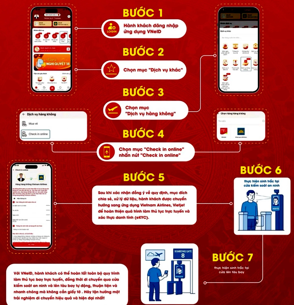 Hành khách có thể làm thủ tục bay trực tuyến tại một số sân bay trong nước thông qua tính năng "Dịch vụ hàng không" tích hợp trên ứng dụng VNeID mức độ 2. Việc thử nghiệm được triển khai tại sân bay Nội Bài, nhà ga T3 - Tân Sơn Nhất, Đà Nẵng, Phú Quốc, Cam Ranh, Phú Bài, Cát Bi, với sự tham gia của một số hãng hàng không.