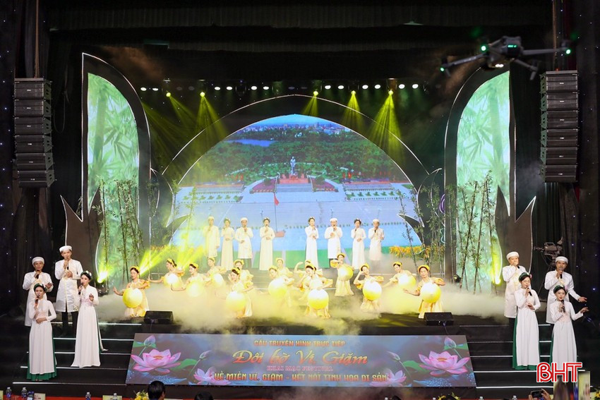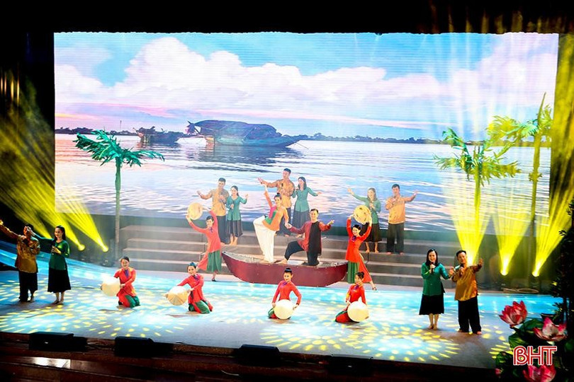 Với những giá trị văn hóa, âm nhạc xuyên biên giới, tiếng búa vinh danh của UNESCO đã đưa ví, giặm Nghệ Tĩnh cùng các di sản của nước ta vươn tầm biển lớn. Trong ảnh: Tiết mục mở đầu của cầu truyền hình nghệ thuật “Đôi bờ ví, giặm” được tổ chức tại TP Hà Tĩnh vào đêm 27/11.