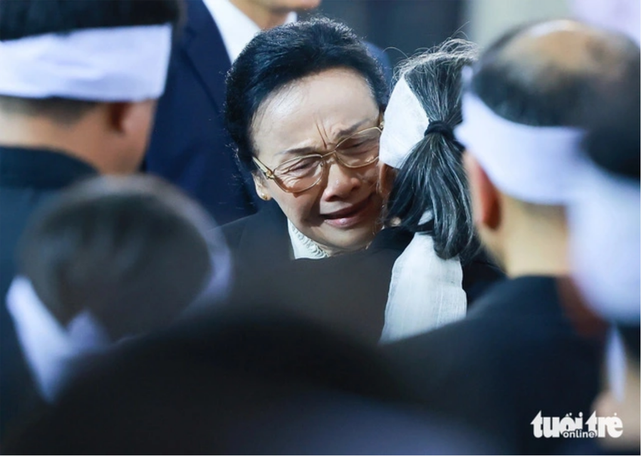 Phu nhân Tổng Bí thư Lào Naly Sisoulith bật khóc và ôm bà Ngô Thị Mận - phu nhân Tổng Bí thư Nguyễn Phú Trọng tại lễ viếng - Ảnh: NGUYỄN KHÁNH