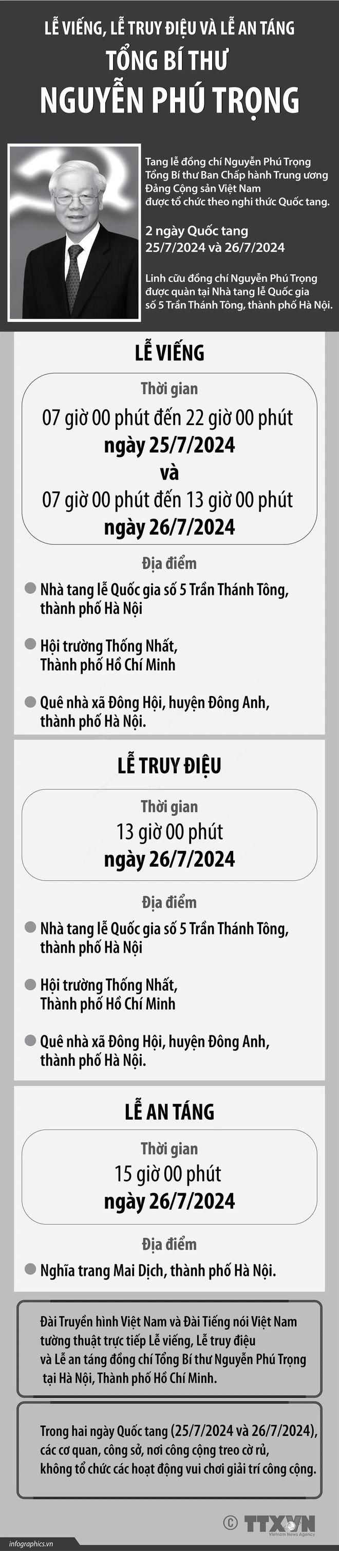 Lễ truy điệu Tổng Bí thư Nguyễn Phú Trọng bắt đầu từ 13 giờ cùng ngày đồng thời tại 3 địa điểm nói trên.