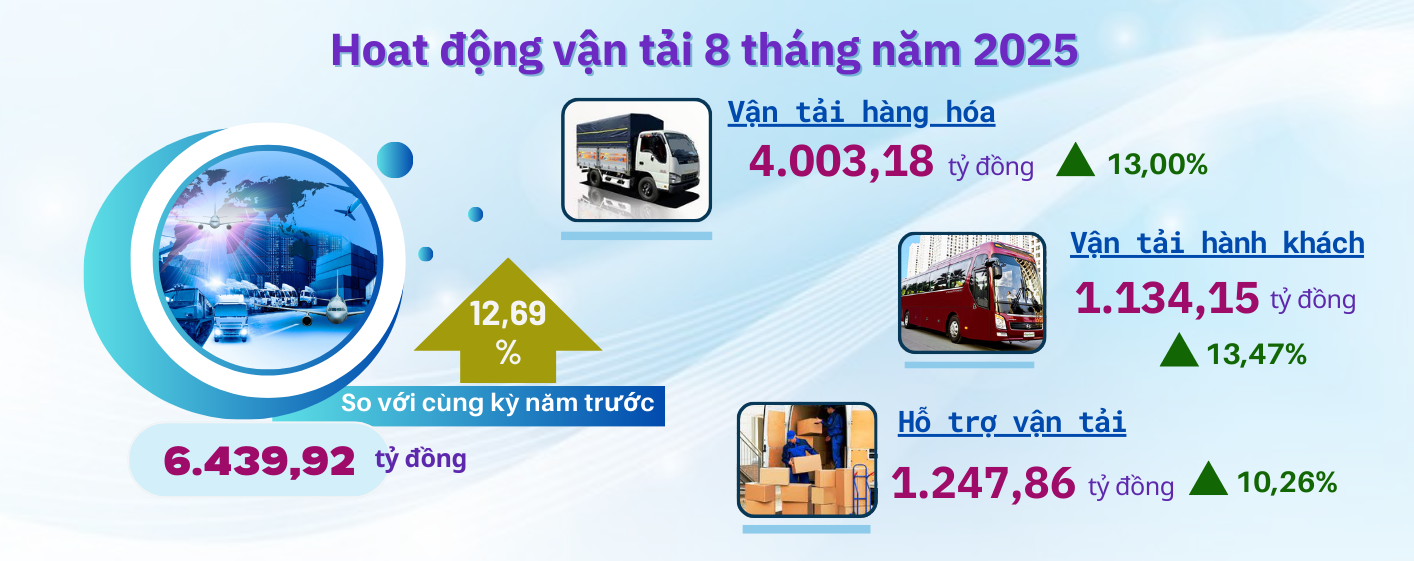 Tính chung tám tháng năm 2025, doanh thu vận tải dự tính đạt 6.439,92 tỷ đồng, tăng 12,69% so với cùng kỳ năm trước, trong đó: Vận tải hành khách dự tính đạt 1.134,15 tỷ đồng, tăng 13,47% với số lượng vận chuyển đạt 11.369,03 nghìn hành khách, tăng 17,08 % và luân chuyển đạt 2.058,92 triệu hành khách.km, tăng 13,45%; vận tải hàng hóa dự tính đạt 4.003,18 tỷ đồng, tăng 13,0% với khối lượng vận chuyển ước đạt 42.324,49 nghìn tấn, tăng 22,78% và luân chuyển ước đạt 1.365,0 triệu tấn.km, tăng 23,88%. Doanh thu kho bãi, dịch vụ hỗ trợ vận tải ước đạt 1.247,86 tỷ đồng, tăng 10,26% so với cùng kỳ năm trước.