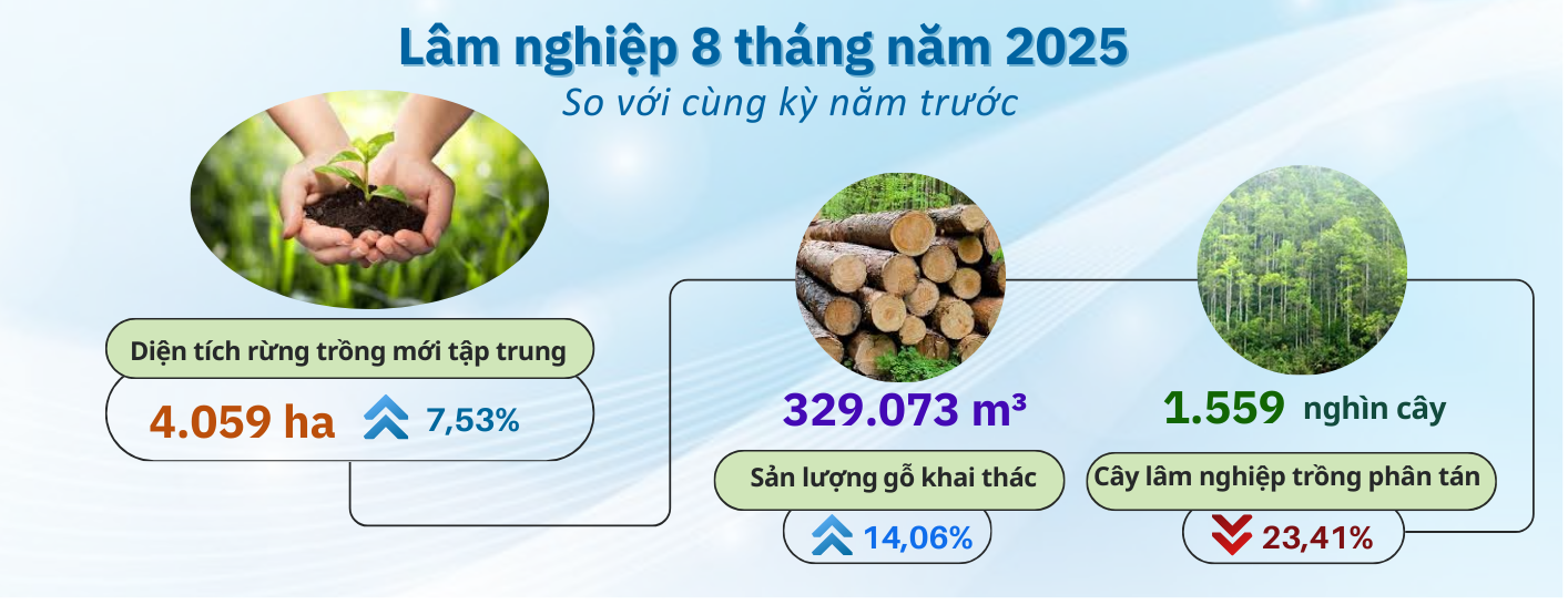 Diện tích rừng trồng mới tháng 8/2025 ước đạt 432 ha, tăng 7,26% so với cùng kỳ năm trước. Do thời tiết nắng nóng kéo dài nên trong tháng không trồng cây lâm nghiệp phân tán. Sản lượng gỗ khai thác trong tháng ước đạt 40,19 nghìn m3, tăng 0,07% do giá gỗ nguyên liệu có xu hướng tăng, người dân đẩy mạnh khai thác gỗ đến tuổi thu hoạch.