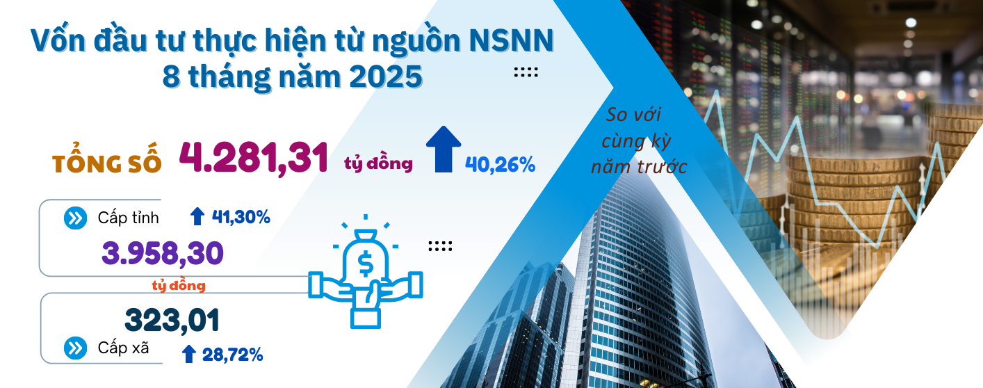 Tính chung 8 tháng năm 2025, tổng nguồn vốn ngân sách Nhà nước do địa phương quản lý ước đạt 4.281,31 tỷ đồng, tăng 40,26% so với cùng kỳ năm trước. Trong đó: Vốn ngân sách nhà nước cấp tỉnh ước đạt 3.958,30 tỷ đồng, tăng 41,30% so với cùng kỳ năm trước; vốn ngân sách nhà nước cấp xã ước đạt 323,01 tỷ đồng, tăng 28,72% so với cùng kỳ năm trước.