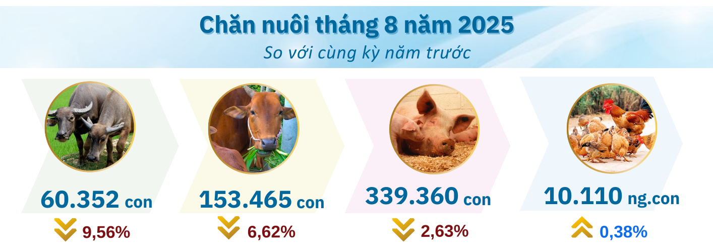 Ngược lại, tổng đàn trâu bò có xu hướng giảm do hiệu quả chăn nuôi thấp: đàn trâu ước đạt 60.352 con, giảm 9,56% (giảm 6.378 con), đàn bò ước đạt 153.465 con, giảm 6,62% (giảm 10.885 con).