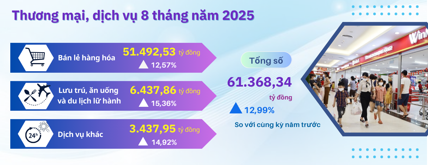 Tính chung tám tháng năm 2025, tổng mức bán lẻ hàng hóa và doanh thu dịch vụ tiêu dùng ước đạt 61.368,34 tỷ đồng, tăng 12,99% so với cùng kỳ năm trước. Trong đó: