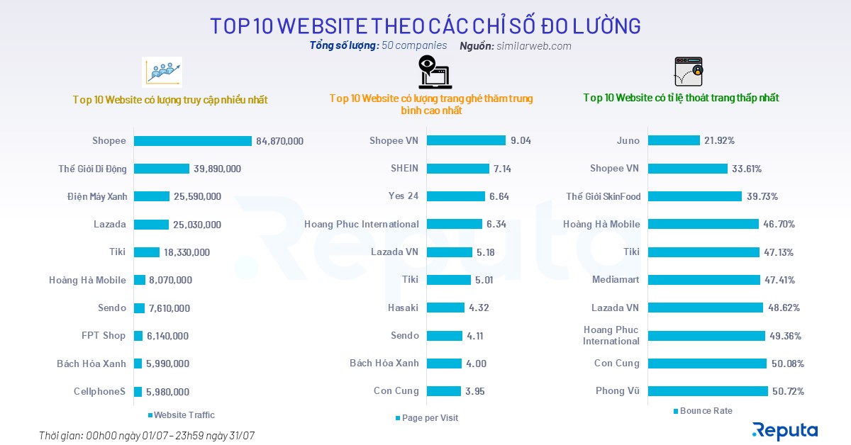 Theo báo cáo TMĐT của Hệ thống lắng nghe và giám sát danh tiếng dành cho DN Reputa, bảng xếp hạng TMĐT của đơn vị này đánh giá trên 50 trang web lớn tại Việt Nam theo 2 tiêu chí. Tiêu chí đầu tiên là tổng thảo luận/tháng. Tiêu chí thứ 2 là tổng điểm của các yếu tố bao gồm: Chỉ số cảm xúc, được tính giữa tổng lượng thảo luận tích cực và tiêu cực; Chỉ số thị phần thảo luận; Chỉ số tương tác bao gồm lượt thích, lượt chia sẻ và lượt bình luận; Chỉ số truy cập website.