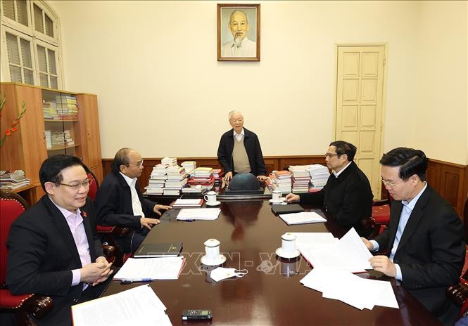 Tổng Bí thư Nguyễn Phú Trọng phát biểu kết luận cuộc họp. Ảnh: Trí Dũng/TTXVNTham dự có: Chủ tịch nước Nguyễn Xuân Phúc; Thủ tướng Chính phủ Phạm Minh Chính; Chủ tịc