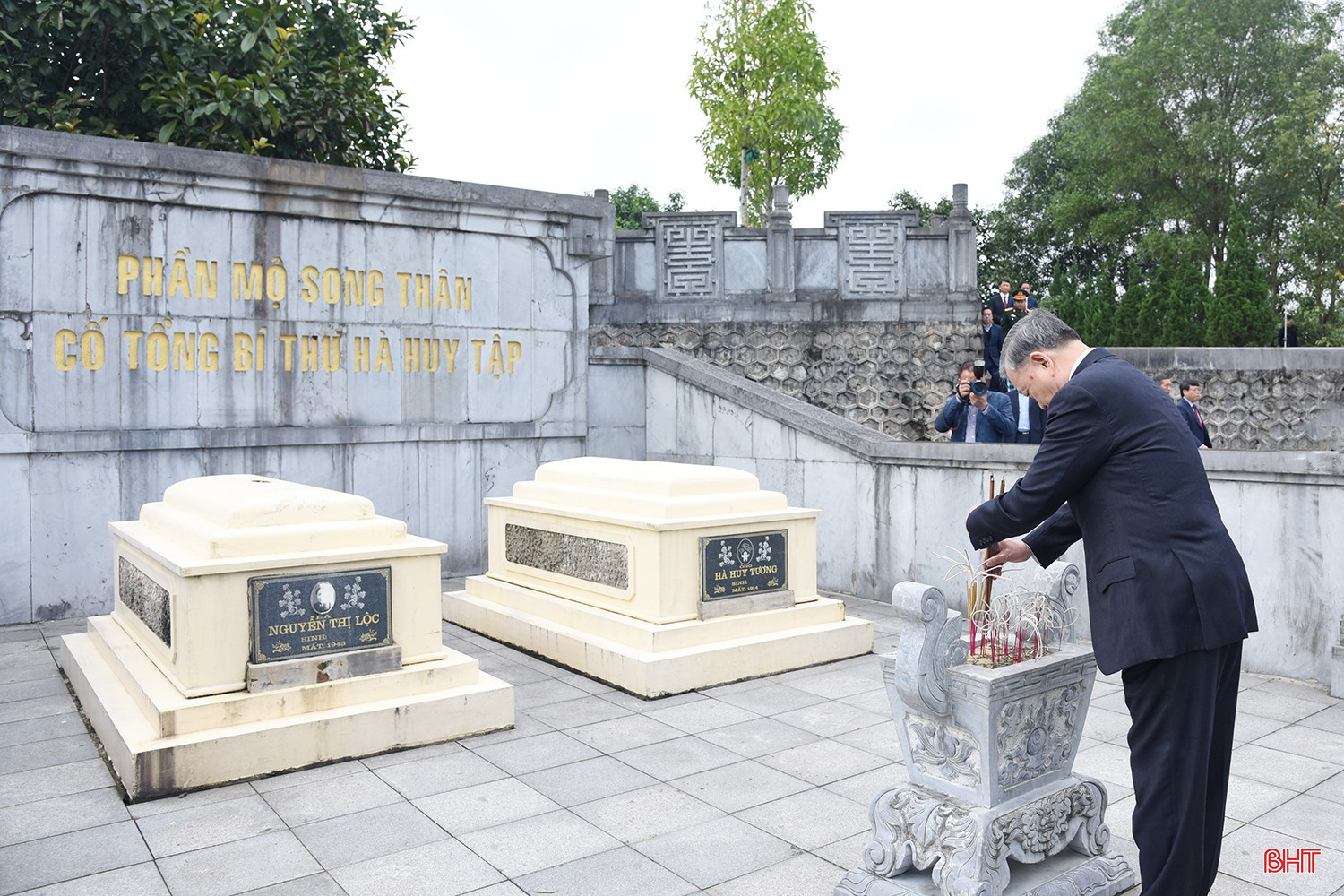 Tại khuôn viên khu mộ Tổng Bí thư Hà Huy Tập, Tổng Bí thư Tô Lâm và đoàn đã đến dâng hương lên phần mộ ông Hà Huy Tương, bà Nguyễn Thị Lộc - song thân cố Tổng Bí thư.