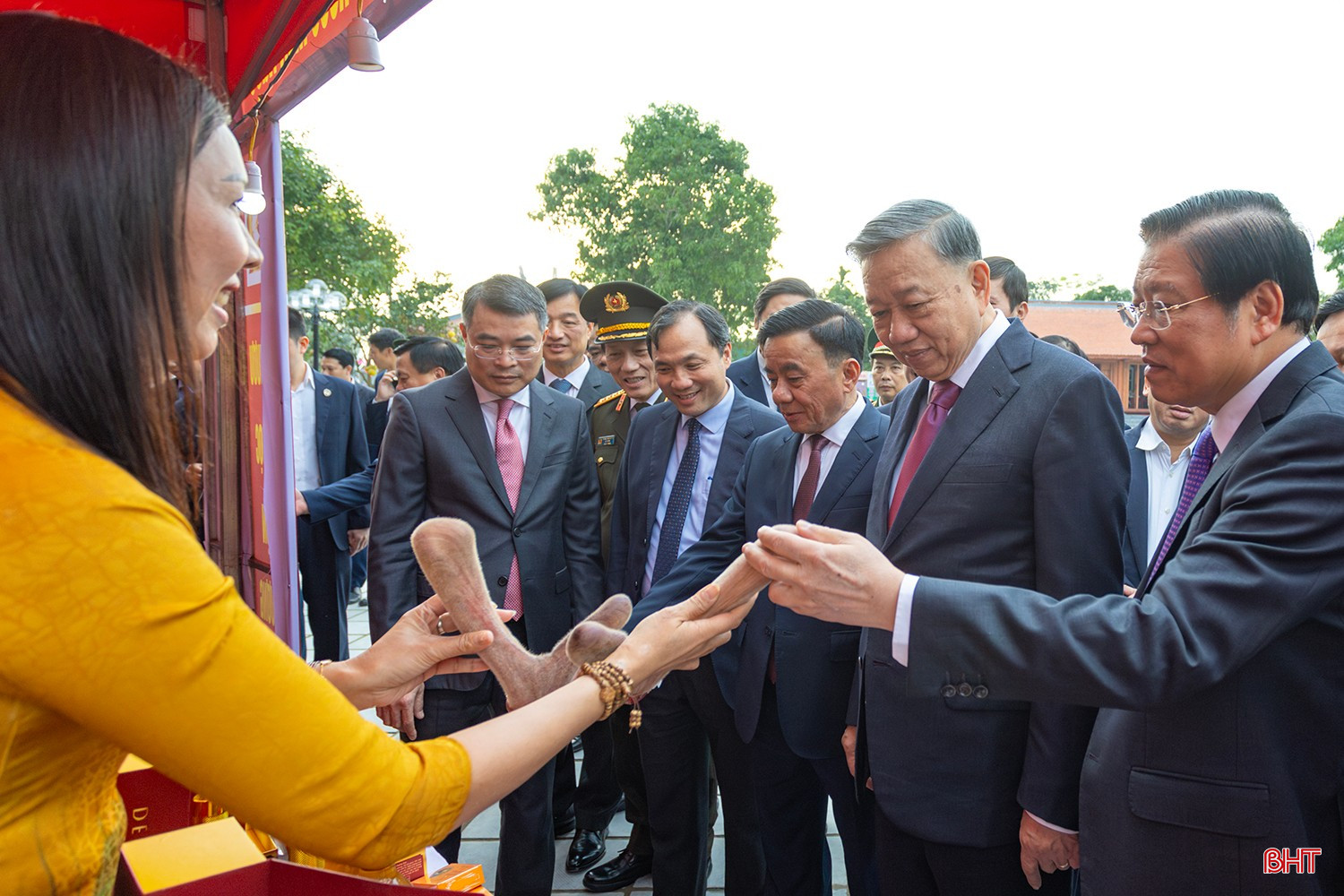 Tổng Bí thư Tô Lâm và các đồng chí lãnh đạo Trung ương, tỉnh Hà Tĩnh tham quan gian hàng OCOP tại khuôn viên khu mộ và tượng đài Hải Thượng Lãn Ông.