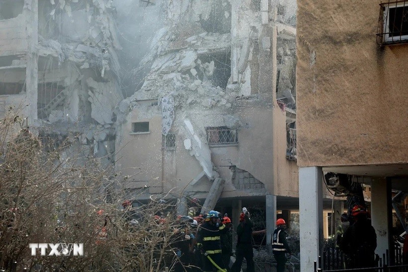 Tòa nhà bị phá hủy sau cuộc tấn công tên lửa tại Holon, Israel sáng 22/6. (Ảnh: THX/TTXVN)