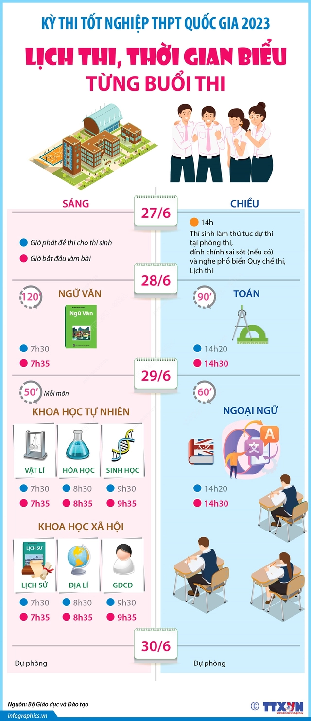 Kỳ thi tốt nghiệp THPT năm 2023 dự kiến có trên 1 triệu thí sinh đăng ký dự thi. Chiều ngày 27/6, thí sinh làm thủ tục dự thi. Sáng 28/6, thí sinh thi ngữ văn, chiều cùng ngày thí sinh thi toán. Sáng 29/6, thí sinh làm bài thi tổ hợp, chiều cùng ngày thí sinh thi ngoại ngữ. Ngày 30/6 là ngày thi dự phòng.