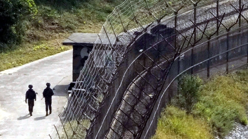 Binh sĩ Hàn Quốc tuần tra ở khu vực dọc hàng rào dây thép gai ở Paju, Hàn Quốc gần biên giới với Triều Tiên - Ảnh: AP