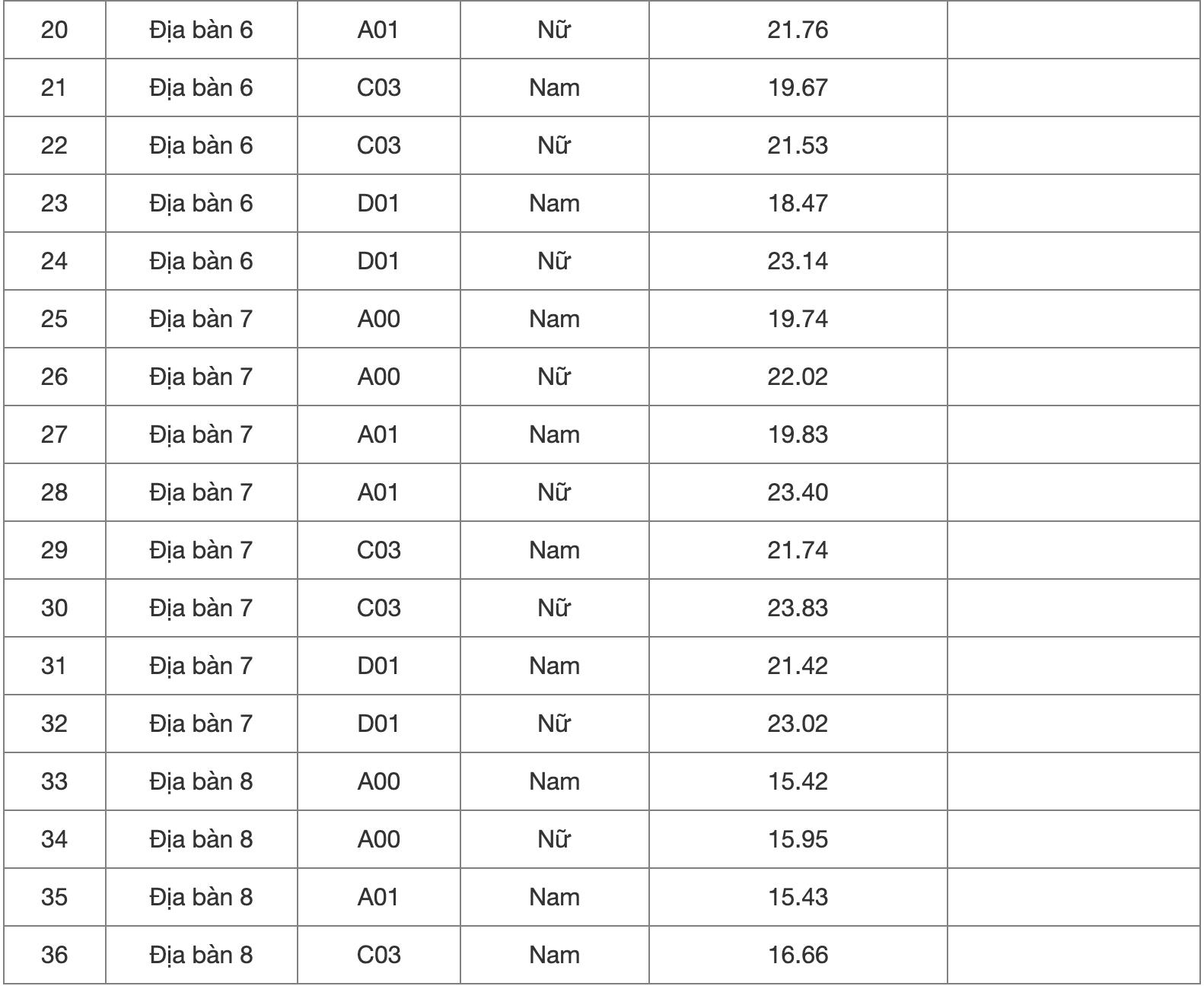 Mức điểm chuẩn dao động từ 15,42 đến 24,43 điểm tùy địa bàn và khối ngành và giới tính. Trong đó, địa bàn 5, khối A01, đối với thí sinh nữ lấy mức điểm cao nhất. Cụ thể như sau: