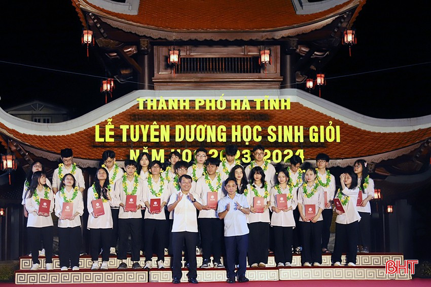 Phó Bí thư Thường trực Tỉnh ủy Trần Thế Dũng, Bí thư Thành ủy Dương Tất Thắng trao thưởng cho các em đạt học sinh giỏi quốc gia năm học 2023-2024 trên địa bàn thành phố Hà Tĩnh.